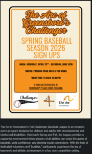 RegisterThe Arc of Greensboro’s Fall Challenger Baseball League is an inclusive sports program designed for children and adults with developmental and intellectual disabilities. Held each Spring and Fall, the league provides a supportive environment where players of all abilities can enjoy the game of baseball, build confidence, and develop social connections. With the help of dedicated volunteers and “buddies,” participants experience the joy of teamwork and athletic achievement in a fun, non-competitive setting.